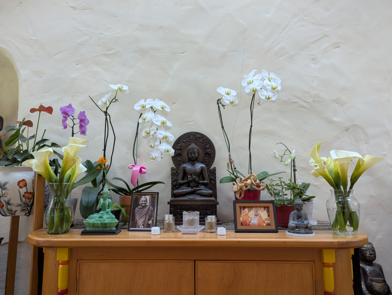 The meal is at 10:45am on Mon., Tues. Wed., Thurs., Sat. and Sunday. Please feel free to join us. If you would like to simply drop off an offering, it may be helpful to know that there is usually someone in the kitchen between 10am and 10:45am. You are always welcome to make offerings for the meal. If you wish, you can let us know in advance, but this is not required. Please note that on Fridays, there is not a meal offering at Three Jewels. If you plan to be present for the meal at Three Jewels, it is customary to bring an offering.