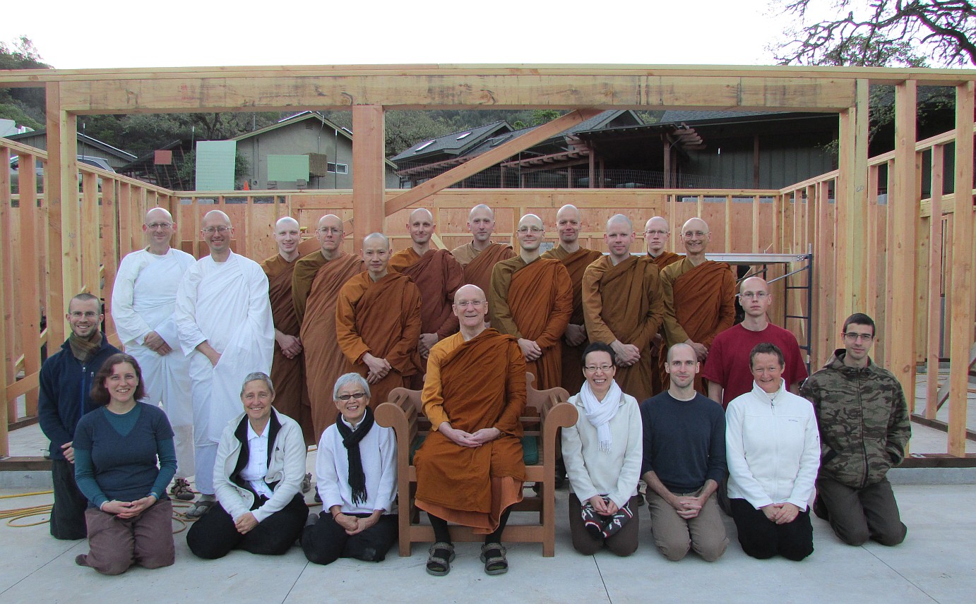 Back row (left to right): Anāgārika Doug, Anāgārika John, Tan Suhajjo, Tan Kaccāna, Tan Kassapo, Ajahn Ñaniko, Tan Sudhīro, Tan Ṭhitapañño, Tan Thanāvaro, Tan Pamutto, Sāmaṇera Gambhīro, Ajahn Karuṇadhammo, Douglas Kadlec