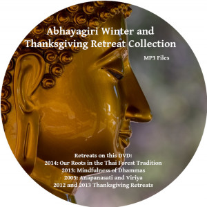 This mp3 CD contains Dhamma talks, guided meditations, and questions and answers from the 2013 Abhayagiri Thanksgiving Monastic Retreat which occurred from November 22 to December 1 at the Angela Center in Santa Rosa, California. The pdf file contains an index of talks and questions. The CD contents are also available for online browsing and request as part of the 2014 Winter Retreat DVD Collectio…