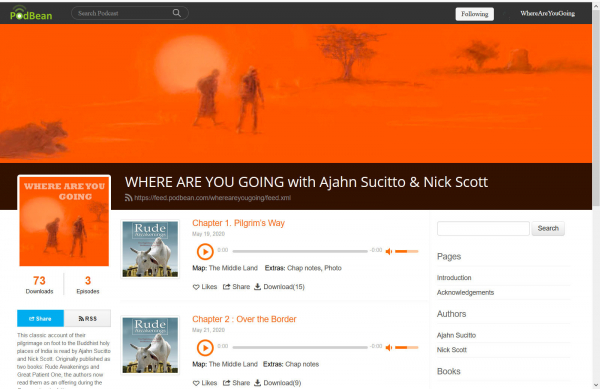 As an offering during this time of the COVID-19 virus, Ajahn Sucitto and Nick Scott are publishing a free weekly podcast with the audio of these books. The podcast is titled “Where Are You Going” and plans to publish one chapter per week. The books constitute 28 chapters, so the podcast will last for more than 6 months. Each audio chapter will have the map, notes and any photos for that chapter attached to it, so that they can be opened by the listener.